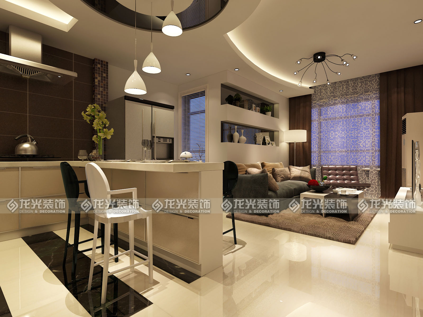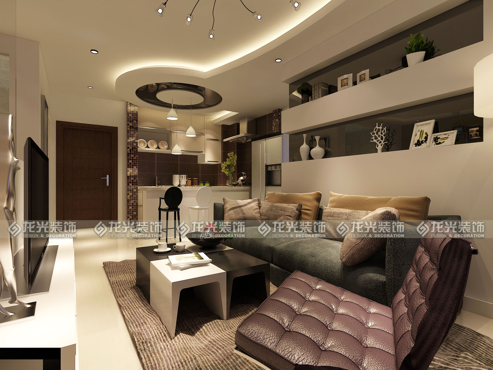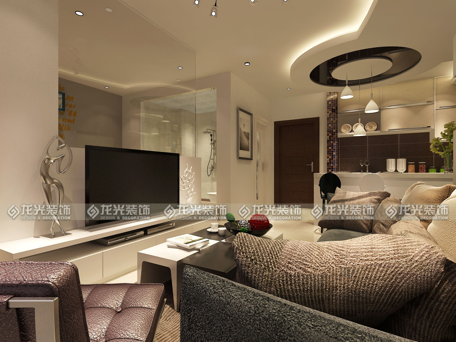 本案是给一对年轻夫妇打造的休闲度假公寓,定义为现代风格,用黑白灰三色为主色调,材质以镜面,瓷砖,壁纸来搭配,墙体的拆除将整个房间的空间感打开,顶面圆弧型的造型让空间更为灵动,不单一,敞开厨房,通透的卫生间玻璃,都为了让整个空间显得格外明亮。