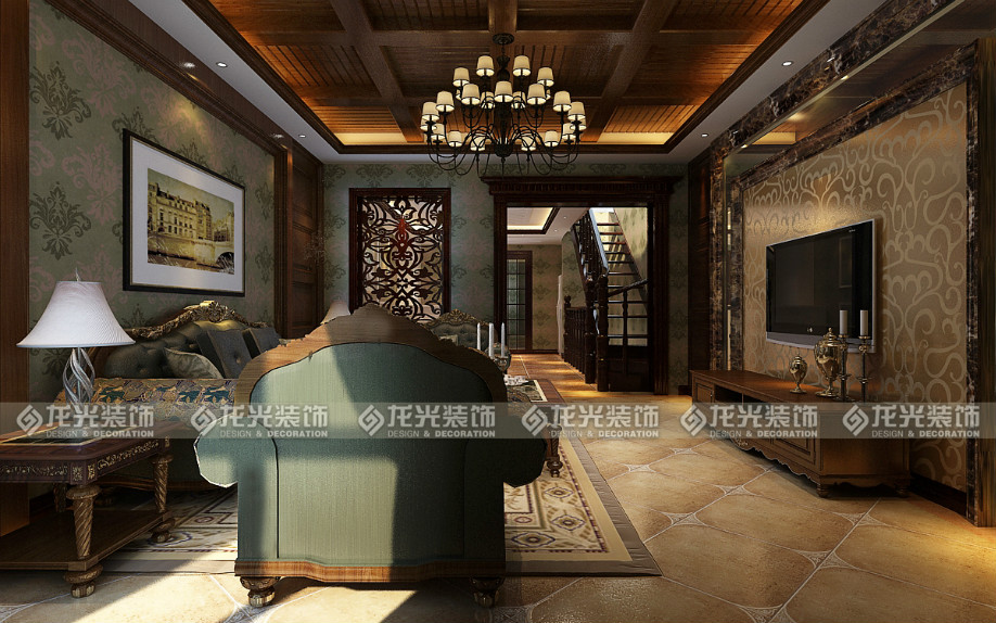 运用理石和木质的质感、墨绿色的皮沙发、复古的拼花地砖、淡绿色的墙面、流露出一股浓浓的美式风情!